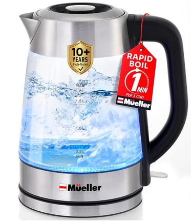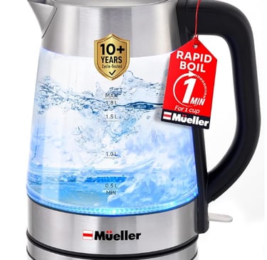 Many other customers also highlight how fast the Mueller kettle boils water as one of its strongest points. They often mention being pleasantly surprised at how quickly it heats compared to older or cheaper kettles they’ve used. Comments about the safety features — such as automatic shut‑off and boil‑dry protection — are frequent, with people saying they feel more comfortable leaving the kettle to heat while doing other things (making breakfast, etc.). The glass body and aesthetic are praised: users like being able to see the water and the blue LED indicator adds a nice modern touch.