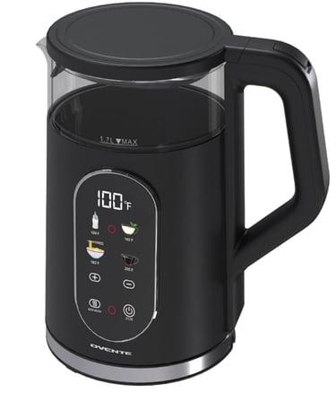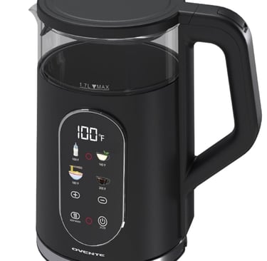 The Ovente 1.7‑liter electric kettle runs on a 1500‑watt heating element, which is strong enough to boil water relatively quickly, particularly useful when mornings are rushed. It holds 1.7 liters of water — a capacity sufficient for multiple cups of tea or coffee without constantly refilling. The kettle body is made from materials such as borosilicate glass (in some models) and stainless steel, with BPA‑free plastic components in some parts. Safety features include auto shut‑off when the water boils and boil‑dry protection in case it's accidentally switched on without enough water. There's also a water level gauge so you can see how much water you’ve added. Some models have removable filters for limescale, stay‑cool handles, and LED indicator lights. The base is often cordless (360° swivel), making it convenient to lift and pour without fuss.