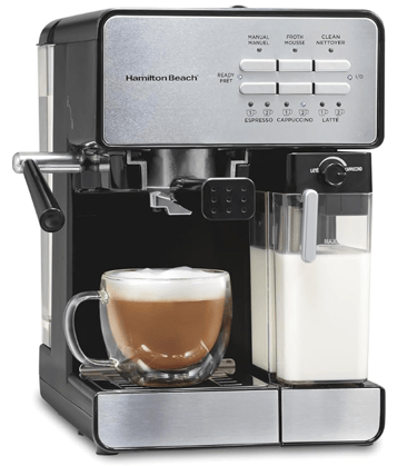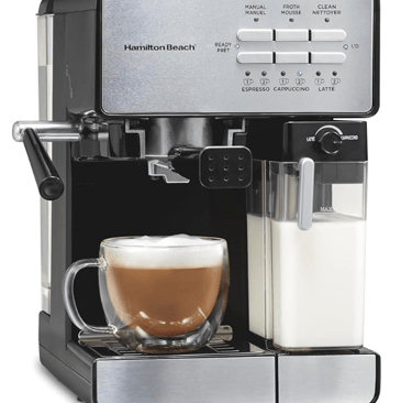 The Hamilton Beach Slide & Lock Espresso Machine features a 15‑bar pump, designed to provide sufficient pressure for espresso extraction with a decent crema. It uses a patented “Slide & Lock” portafilter system: you slide the portafilter in from the front and lock it in place on the side, which is intended to simplify the portafilter handling compared to more traditional brew‑head lock systems. The machine has two spouts in the portafilter so you can brew either a single or double shot of espresso simultaneously. It also includes a built‑in swiveling frothing wand with an adjustable steam dial for steaming or frothing milk to make lattes, cappuccinos, etc. A pressure dial is visible on the front of the machine so you can monitor pressure while brewing. There is a removable water reservoir to make refilling and cleaning easier. The design is relatively compact, with retro style cues; dimensions are modest so it doesn’t take up a huge amount of counter space. It comes with accessories like a scoop and tamper, and both single and double stainless steel filter baskets. The wattage is moderate (around 1050‑1100W depending on version) which helps keep price down while delivering enough power for basic espresso extraction.